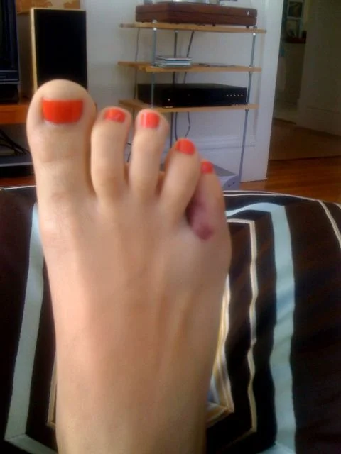 Toe might be broken. Apparently if you try pulling on it, you can find out for sure, but if I pull on it, I might wretch. Leah Buley August 27, 2009